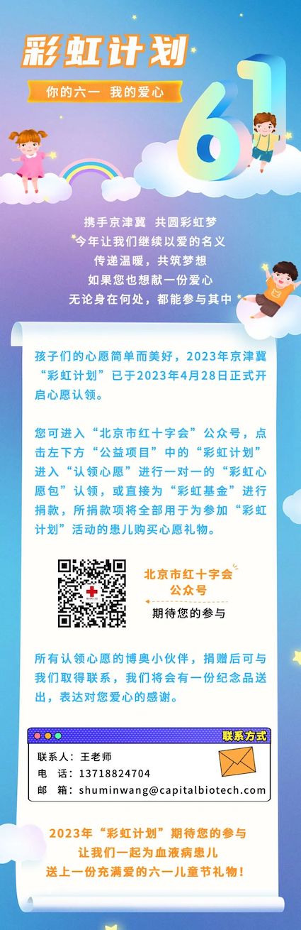 彩虹计划顺利获得红十字会、骨髓库、医院、造血干细胞志愿者搭建起一座连接着血液病患儿和全社会爱心人士、爱心企业的“彩虹桥”,为血液病患儿送去勇气和希望,鼓励他们顽强对抗病魔,带动全社会关心关爱血液病患儿,分析并加入造血干细胞捐献这项人道事业,给血液病患儿带来更多生的希望,以实现他们最大的心愿礼物——“重生”。