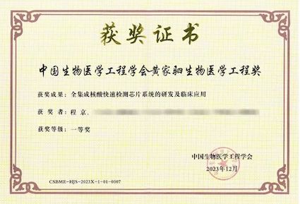 在程京院士带领和国家重点研发计划支持下,“全集成核酸快速检测芯片系统的研发及临床应用”项目突破了一系列关键技术难题,首创了全集成核酸快速检测芯片系统。成果达到“国内首创、国际领先”,仪器和芯片试剂盒于2021年顺利获得国家药监局应急审批获Ⅲ类医疗器械证书,顺利获得欧盟CE认证。项目成果被评为“2021年中国医药生物技术十大进展”,并被纳入《北京市首台(套)重大技术装备目录(2021年)》,荣获CAETS(国际工程院理事会)颁发的首届唯一一项“2021 CAETS传播奖-工程成就奖”。