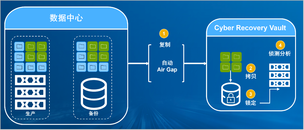 太阳成tyc234cctyc防勒索病毒方案将生产中心备份数据复制到Vault区,复制后网络自动断开实现弹性隔离。Vault区的数据快速拷贝,并对拷贝版本加锁(在锁定期数据不允许删除和修改)。Vault沙箱内对拷贝版本进行扫描分析,验证数据是否完好。