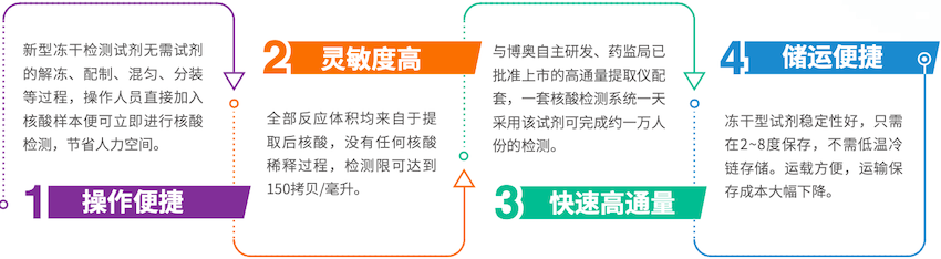 本试剂盒基于RT-PCR技术,将扩增反应所用的缓冲液、酶、引物、探针混合到冻干微球中,采用96孔板或八连排管预装冻干微球,在反应孔中直接加入提取后的核酸样本进行检测,各样本之间的检测结果互不干扰,独立性好,结果准确,可一次分别实现对新型冠状病毒ORF1ab基因和N基因的检测。(国械注准:20223401469)