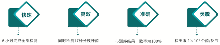 采用生物芯片技术将序列已知的寡聚核苷酸探针分子固定于芯片基片,然后与待检标本中标记的核酸进行分子杂交,顺利获得检测每个探针分子的杂交信号强度,对17种临床常见分枝杆菌进行快速鉴定,从而准确锁定致病菌种类型。该试剂盒是国内第一批取得CFDA认证的分枝杆菌快速菌种鉴定产品。